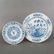 Chinees porseleinen schotel met blauw-wit tuindecor en servetrand -gelijmd-, Ø 38 cm, en Chinees porseleinen schotel met blauw-wit floraal decor -randchips, twee rechthoekige afdrukken in de rand-, beide 18e eeuw