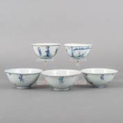 Vijf Chinees porseleinen kommen met diverse blauw-witte decors, Ming -haarlijnen-, Ø 15,5 cm