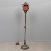 Cloisonné staande vloerlamp met lantaarnvormige opengewerkte kap, bespannen met rood textiel, Japan, eerste helft 20e eeuw -één krul lantaarn afgebroken, gebruikssporen-, 150 × Ø 25 cm