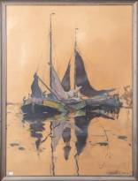 Hollandse School: botters op het water, aquarel, r.o. gesigneerd Henk Rems -gebruind, golvend papier-, 78 × 58 cm