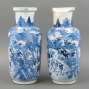 Paar Chinees porseleinen rouleau-vazen met blauw-wit decor van een leger of een grootschalige jachtpartij, Kangxi gemerkt, 19e eeuw -defecten aan halzen-, 45,5 cm hoog