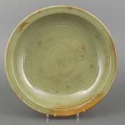 Chinese celadon schotel met ingekerfd bladdecor, meanderrand en florale patronen, Ming-stijl en vermoedelijk periode -randrestauratie, haarlijntje-, Ø 38,5 cm