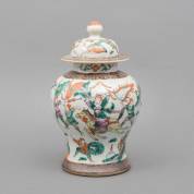 Balustervormige Chinees porseleinen dekselvaas met famille verte decor van strijders, Nanking, circa 1900 -dekselknop gelijmd-, hoogte 32 cm