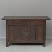 Lage donkergebeitste hardhouten kast met twee deurtjes en twee lades, China, modern -intern schap toegevoegd-, 84 × 140 × 40 cm