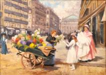 Franse School: bloemenverkoopster in Parijs met de Opéra Garnier in het verschiet, olieverf op board, r.o. gesigneerd Pencke, 20e eeuw, 50 × 70 cm