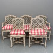Vijf stoelen, waarvan vier armstoelen, alle met rotan bespanning, cabriolepoten en rood-witte kussentjes -bij één armstoel is de rotan zitting vervangen door multiplex; lichte gebruikssporen-