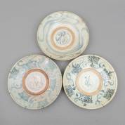 Drie Chinees porseleinen boerenming schotels met blauw-witte decors en biscuit rand -twee met barst-, Ø 28 cm