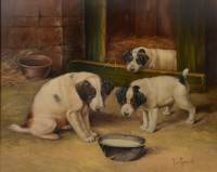 Schilderij: drie hondjes bij voederbak, olieverf op paneel, r.o. gesigneerd J. v. Gemert, 20e eeuw, 39 × 49 cm