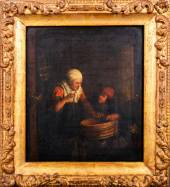 Oleografie naar Gerrit Dou: haringverkoopster met jongen, in verguld houten lijst, 40,5 × 35,5 cm