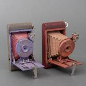 Twee fotocamera's: beide Vest Pocket Hawk-Eye's, in paars/grijs en roze/rood, uitvoering Kodak