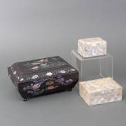 Lakwerk handwerkdoos met ingelegd vogeldecor van parelmoer, Japan, circa 1900 -geen sleutel, gebruikssporen, enkele stukjes parelmoer ontbreken-, 14 × 18 × 20 cm, en twee met parelmoer belijmde kistjes -enkele stukjes parelmoer ontbreken-, grootste 7 × 15,5 × 12 cm