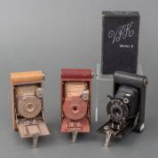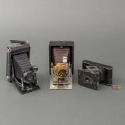 Drie fotocamera's: één Hoh & Hahne, en Kodak Six-20 Doublet, en Vest Pocket Kodak
