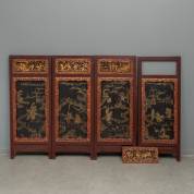 Vierslags lakwerk kamerscherm, tweede helft 20e eeuw -defecten aan lakwerk; één deel en paneeltje los bijgevoegd-, elk deel 124 × 50 cm
