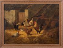 Charles Jacques (1879-1959), stalinterieur met kippen, olieverf op paneel, r.o. gesigneerd -krasjes-, 21 × 29 cm