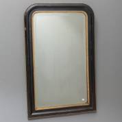 Gefacetteerde spiegel met afgeronde bovenhoeken in zwarte lijst met gouden bies, 19e eeuw, 92 × 59 cm