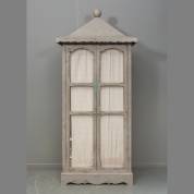 Lichtgrijsgelakte kledingkast met kippengaas in het open naaldhouten frame, en voorzien van puntdakje met bol, modern -gebruikssporen, verbinding uitgebroken bij regeltje rechts, een roede van gordijntje achter linker deur ontbreekt-, ±245 × 108 × 53 cm