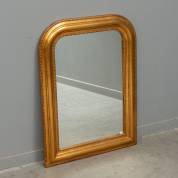 Spiegel in verguld houten lijst met afgeronde bovenhoeken, afgezet met een dubbele parelrand, modern, 81 × 60 cm