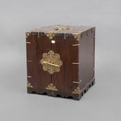 Chinese houten reisapotheek met 22 laatjes en koperen beslag, 19e eeuw, 35 × 30 × 30 cm