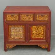 Roodgelakt teakhouten kastje met goudkleurig snijwerk op de deurtjes en ladefronten, waarschijnlijk Chinees-Indonesisch, laatste kwart 20e eeuw -defecten aan snijwerk op rechter deurtje, sommige maar niet alle delen aanwezig; ruitje voor snijwerk op rechter deurtje ontbreekt; en andere slijtages-, 75 × 83 × 40 cm
