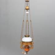 Petroleum hanglamp met majolica reservoir, gedecoreerd met jachtdecor, geëlektrificeerd