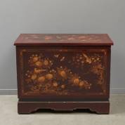 Rode lakwerk kist/televisiemeubel met verguld chinoiseriedecor, het interieur met omhoogspringende plank en zonder achterwand, staande op wieltjes, 77 × 99 × 54,5 cm
