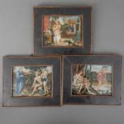 Drie achterglasschilderingen met religieuze scènes uit Genesis: de verdrijving uit het Paradijs, Kaïn en Abel als kinderen, en het offer van Kaïn, 19e eeuw -beetje verfverlies-, 15,5 × 20 cm