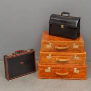 Drie bruin lederen reiskoffers in verschillende formaten -gebruikssporen, enkele krassen-, een zwart lederen aktetas, en een kleine lederen koffer, uitvoering Amiet, afmetingen grootste koffer 50 × 66 × 21 cm