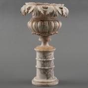 Marmeren coupe op hoge voet met gesneden bladdecor, 20e eeuw -enkele breukjes, coupe en rand verstevigd met kit-, 34,5 × Ø 20 cm