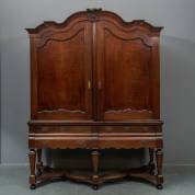 Eiken kruispootkabinet met gecontourneerde kap, twee deuren, vier lades in de onderkast, taps toelopende poten, verbonden door regels, 18e eeuw, circa 224 × 170 × 53 cm