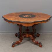 Mahonie en gezwart houten spinnenkoptafel met wortelgefineerd gecontourneerd blad centraal voorzien van inlegwerk, Willem III, uitvoering F.A. van Herpen, Amsterdam -poot wat instabiel, defecten aan blad en inlegwerk, gedraaid ornament van de voet los bijgevoegd-, 74 × 126 × 100 cm