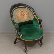 Zwartgelakte damesfauteuil, de groen velours bekleding deels met gros-point borduurwerk, de voorpoten voorzien van wieltjes, Willem III, 86 × 63 × 70 cm