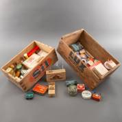 Twee houten kratjes 'Sil' en 'Lux Toiletzeep' met verzameling oude verbandartikelen en medicijnen etc. -gebruikssporen en lege verpakkingen-, herkomst: Kruideniersmuseum Utrecht