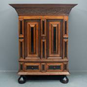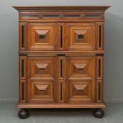 Eiken vierdeurs kussenkast met gezwarte accenten, samengesteld uit 17e-eeuwse onderdelen, 182 × 156 × 62,5 cm