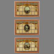 Drie gebrandschilderde glas-in-loodramen met centraal ovale romantische voorstellingen, elk in eikenhouten frame, 48 × 77 cm
