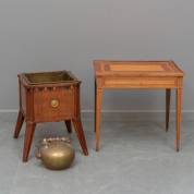 Mahoniegefineerde theestoof met messing binnenbak en ketel -meerdere profieltjes en delen tandlijst ontbreken-, en een bijzettafeltje met lade onder het blad, ingelegd met meerdere houtsoorten, staand op taps toelopende poten -kleine defecten-, beide 19e eeuw, afmetingen laatstgenoemde 46 × 50 × 34 cm