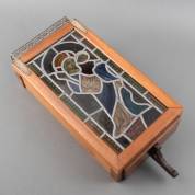 Gebrandschilderd glas-in-loodraam: Maria met Kind, in houten kastje met lamp achter het glas -lamp werkt maar zit los in kastje-, 64 × 27 × 12 cm