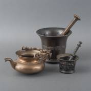 Grote vijzel met reliëfband, kleine vijzel met Franse lelies in reliëf, beide inclusief stamper, en bronzen lavabo, gemerkt *F*X* Chopard Roy à Morteau