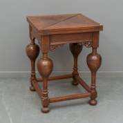 Eiken kaarttafel met rood vilten blad, staand op onderstel met balustervormige poten en tussenregels, Hollandse renaissance-stijl, circa 1900 -gebruikssporen, vilt aan vervanging toe-, ingeklapt 78 × 59 × 59 cm