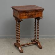 Mahonie naaitafeltje met esdoorn interieur en spiegel onder het blad, staand op getorste poten, circa 1840 -krimpnaad in blad-, 81 × 52 × 41 cm