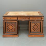 Notenhouten bureau ministre met zwarte houten details en drie lades onder het blad, 19e eeuw -gebruikssporen en defecten, twee profieltjes van lades ontbreken-, 78 × 147 × 78 cm