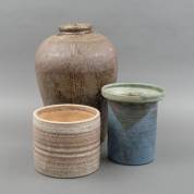 Grote aardewerk vaas en twee bloempotten, één bloempot uitvoering Mobach, de ander met onbekend monogram, de vaas 45 × 36 cm