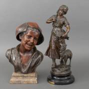 Twee beelden: bronskleurig metalen meisje met schaap, 50 cm -slijtages aan patina-; en bronskleurige kunststof buste van een lachende jongen, 40 cm