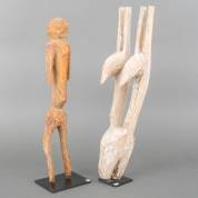 Afrikaans houten tchitcheri voorouderbeeld, Moba/Bimoba, Togo of Ghana, en een witgekalkt Afrikaans houten beeld met dierlijke motieven, beide op basementjes, hoogte laatstgenoemde 58 cm