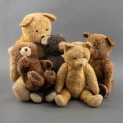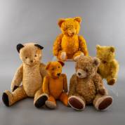 Vijf oude mohair teddyberen, jaren '20-'40 -intensief geknuffeld, herstellingen, één oog ontbreekt-, grootste beer 68 cm