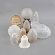 Tien diverse glazen lampenkappen, waarvan acht gesatineerd en twee in armatuur, 19 cm