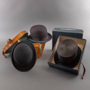 Twee zwarte bolhoeden en een zwarte hoge hoed, met twee hoedendozen -gebruikt-