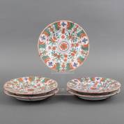 Vijf aardewerk borden met polychroom decor, gemerkt, naar Delfts 18e-eeuws voorbeeld -randschilfers-, Ø 23,5 cm
