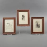 Jozef Israëls (1824-1911), twee etsen: vrouw met schop, en visser met pijp, niet gesigneerd, 9 × 5,5 cm en 8,5 × 4,8 cm, daarbij: prentje naar Rembrandt -watervlek-, 15,5 × 9 cm