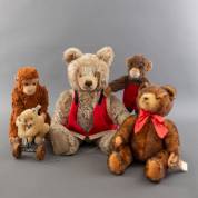 Steiff: goudblonde mohair teddybeer met rood jakje, 66 cm, goudblond trekbeertje 'Record-Teddy', replica 1913, gelimiteerde uitgave 787/4000, uitvoering Margarete Steiff, Giengen-Brenz, Duitsland, 26 cm, Hermann: bruin-oranje mohair teddybeer, uitvoering Gebr. Hermann, Sonneberg, Duitsland, 48 cm, en twee oude mohair apen -bespeeld-, 42 cm