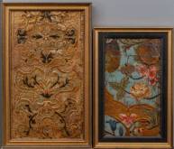 Twee stukjes ingelijst goudleer met polychroom beschilderde florale decors, beide 18e eeuw, grootste exemplaar, 37 × 21 cm